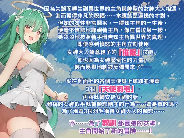 这是一款被迫穿越到异世界的主角从性格恶劣的女神大人那里,获得「催眠」技能,并且利用此技能,不管不顾地干翻在路上遇到的女孩子以及天使们的异世界RPG游戏!