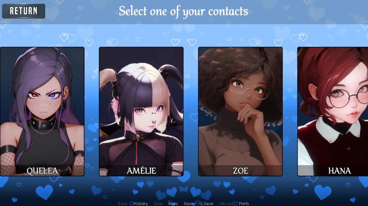各种各样的女孩与她们见面并追求浪漫关系。游戏涉及一个分支叙事,主要故事和角色事件具有多种选择和对话选项!